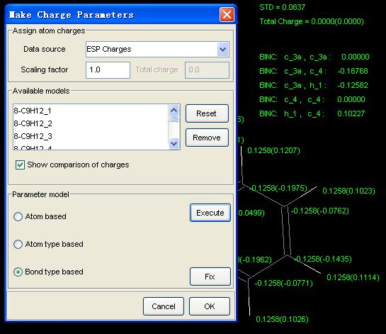 Charge parameters, either atom-type based or bond-type based, can be derived by fitting ab initio electrostatic potentials (ESP).[1] In fitting the electrostatic potentials, certain restrictions might be applied. This is necessary either because of shared (transferred) charge parameters or because of the difficulties in determining charges for atoms shielded by others in bulky molecules.[2, 3]
