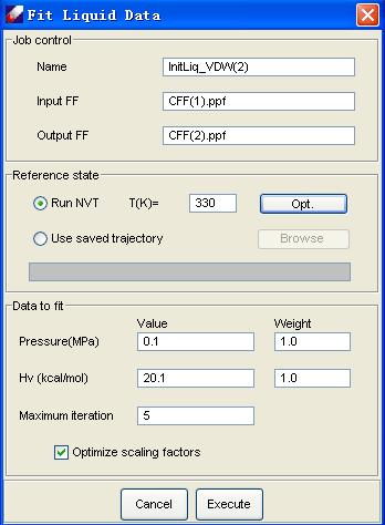 DFF implements a procedure [3] that can be used to optimize VDW parameters automatically. In this procedure, the first derivatives of potential energies and pressures of simulated molecular systems with respect to force field parameters are calculated and used to optimize parameters automatically. Statistical mechanical perturbation theory is utilized to maximize usage of information in molecular dynamics simulation trajectories and, consequently, to reduce computational expenses. Using this procedure, VDW parameters can be derived quickly and accurately. The following chart illustrates the liquid fit dialog.
